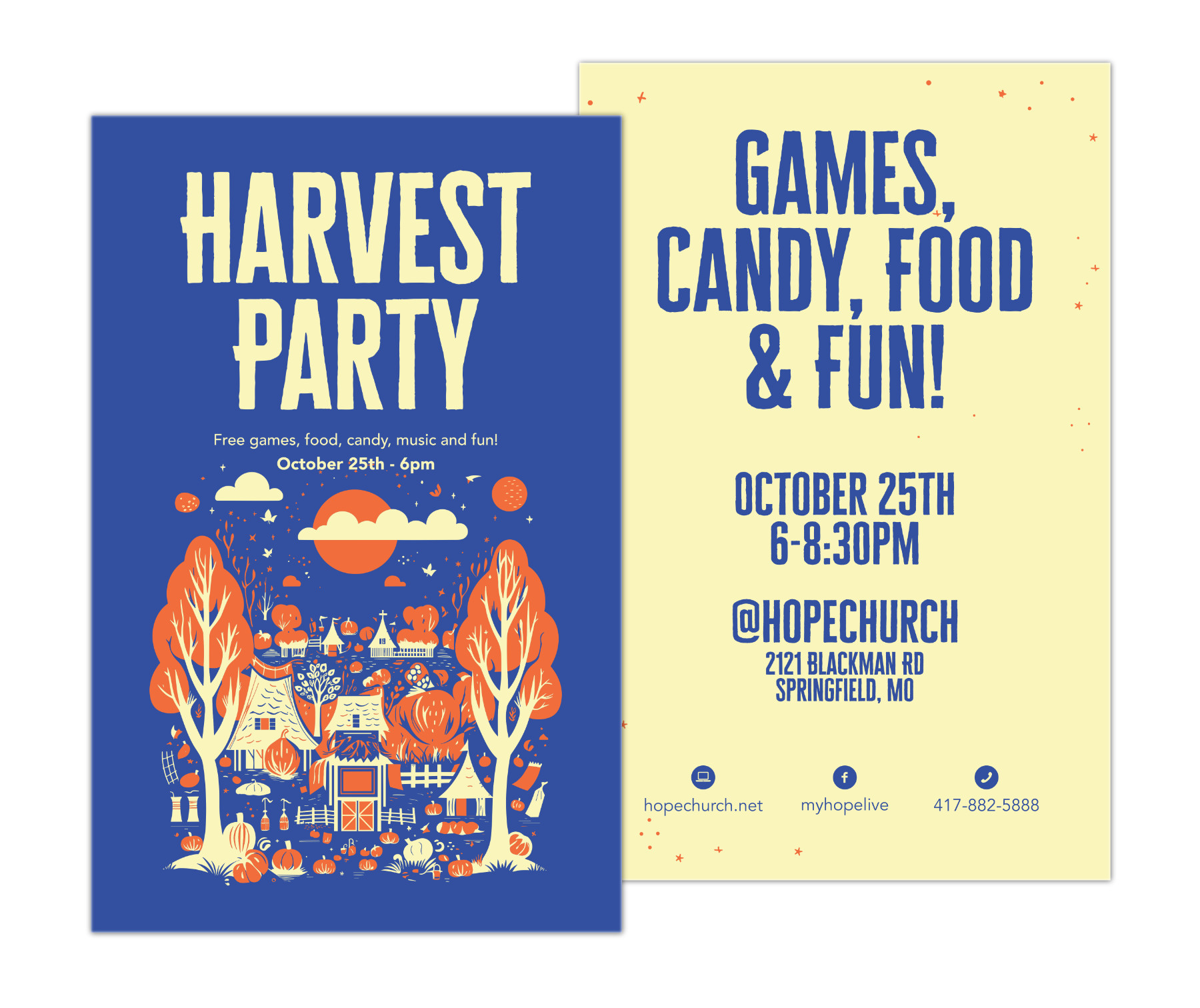 Hope Church created Harvest Party as a fun autumn event for families in the community to play games, hear music and enjoy treats. Over the years, the target market has expanded. Kids and families are still attending in large numbers. However, with a growing student population in Springfield, more and more students are interested fun things to do in the fall. The styles have evolved and I've created main graphics, signs and social ads for this event.